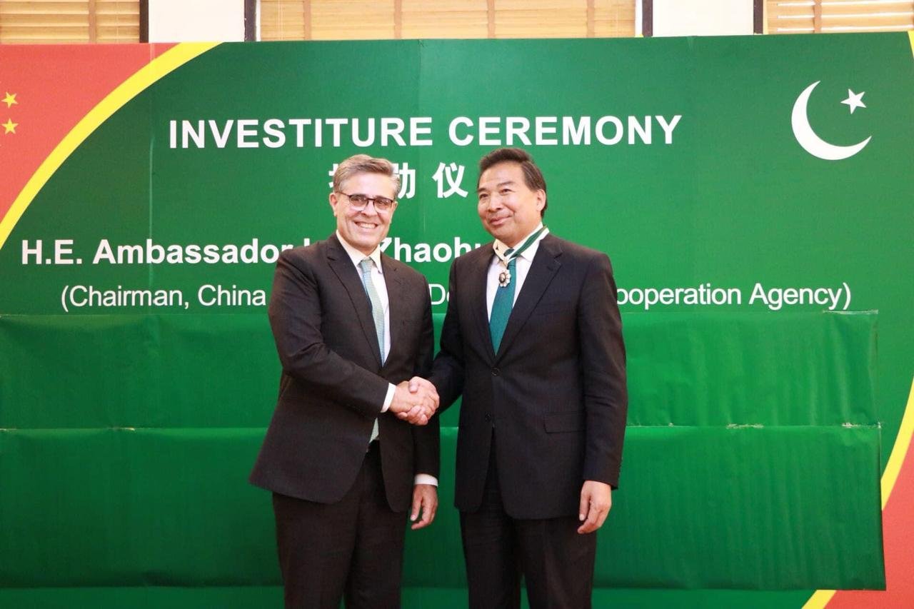 Beijing, 17 April 2024 (TDI): On behalf of the President of Pakistan, Ambassador Khalil Hashmi conferred the civil award “Hilal-i -Quaid-i-Azam” on Ambassador Luo Zhaohui, Chairman of the China International Development Cooperation Agency (CIDCA), at an elegant investiture ceremony held at the Embassy of Pakistan today.