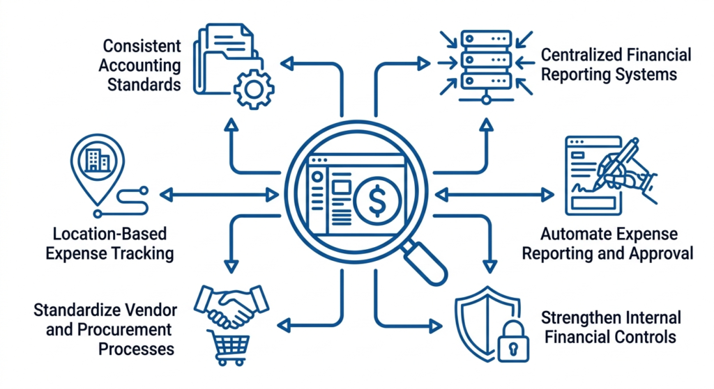 Effective multi-location expense management requires standardized accounting procedures, centralized reporting systems, and clear financial oversight. When businesses implement structured financial controls, leadership teams can monitor spending patterns while maintaining accurate financial reporting across all locations.