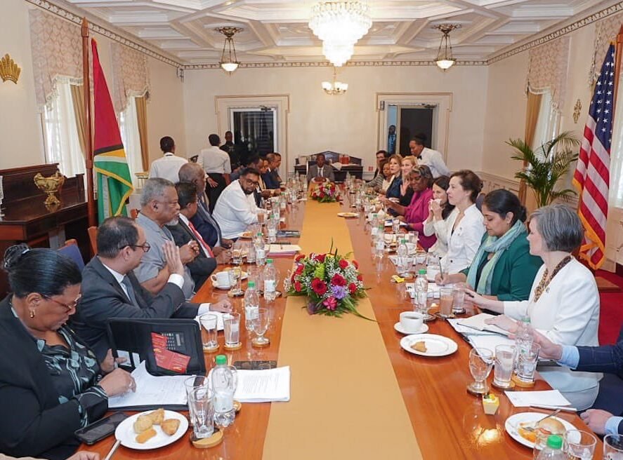 President Ali said, “Today I met a 12-member delegation from the United States. Ambassador Thomas led the delegation which included the US Ambassador to Guyana Nicole and more”.